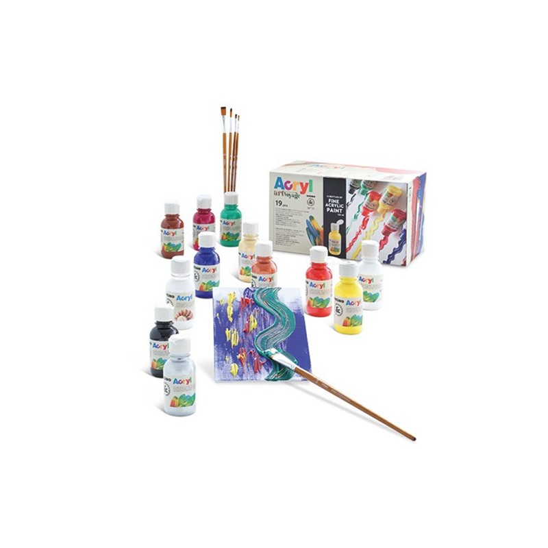 Set artistico con colore acrilico fine in bottiglie da 125 ml, 11 colori, 1 vernice lucida, 2 cartoncini telati 18x24 cm, 5 pennelli: tondo 5,8; piatto 6,10,18.